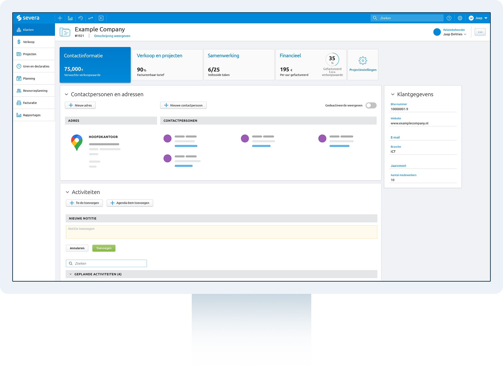 Plan gesprekken en taken in de agenda of verbind je agenda met Severa. De CRM herinnert je aan activiteiten en archiveert contacten in de klantinformatie.